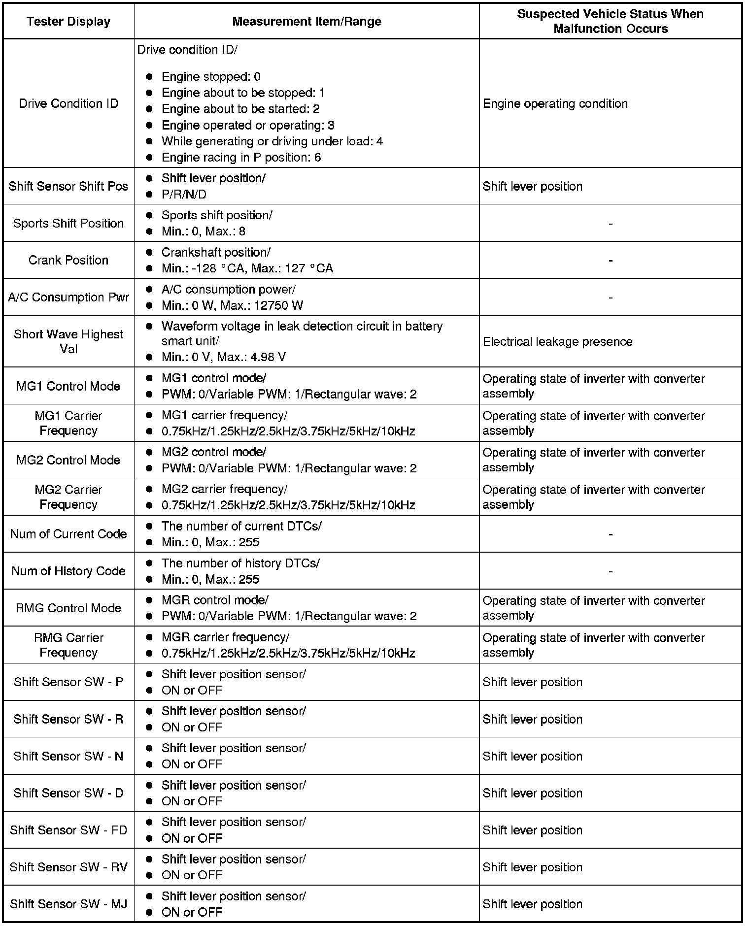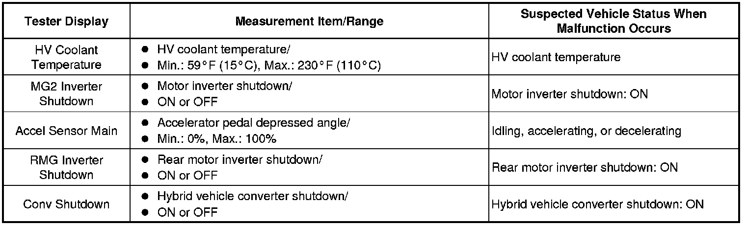 The power management control ECU (HV CPU) records vehicle and driving condition information as freeze frame data the moment a DTC is stored. It can be used for estimating or duplicating the vehicle conditions that were present when the malfunction occurred. To confirm the details of the hybrid control system, check the detailed information for the DTC information code in the Data List (INF code).