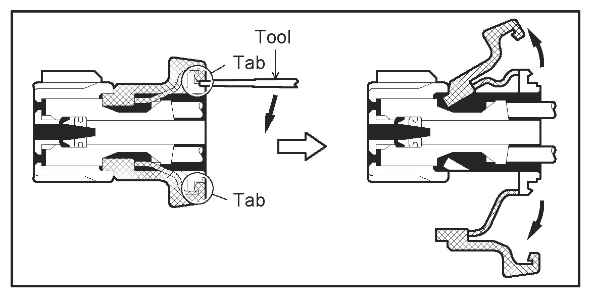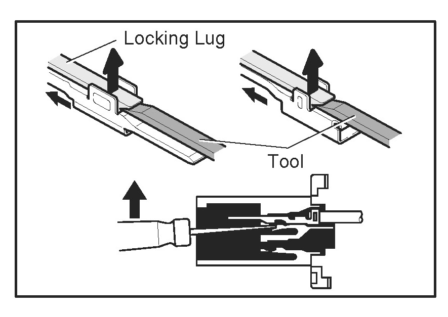 a. Locking device must be disengaged before the terminal locking clip can be released and the terminal removed from the connector.