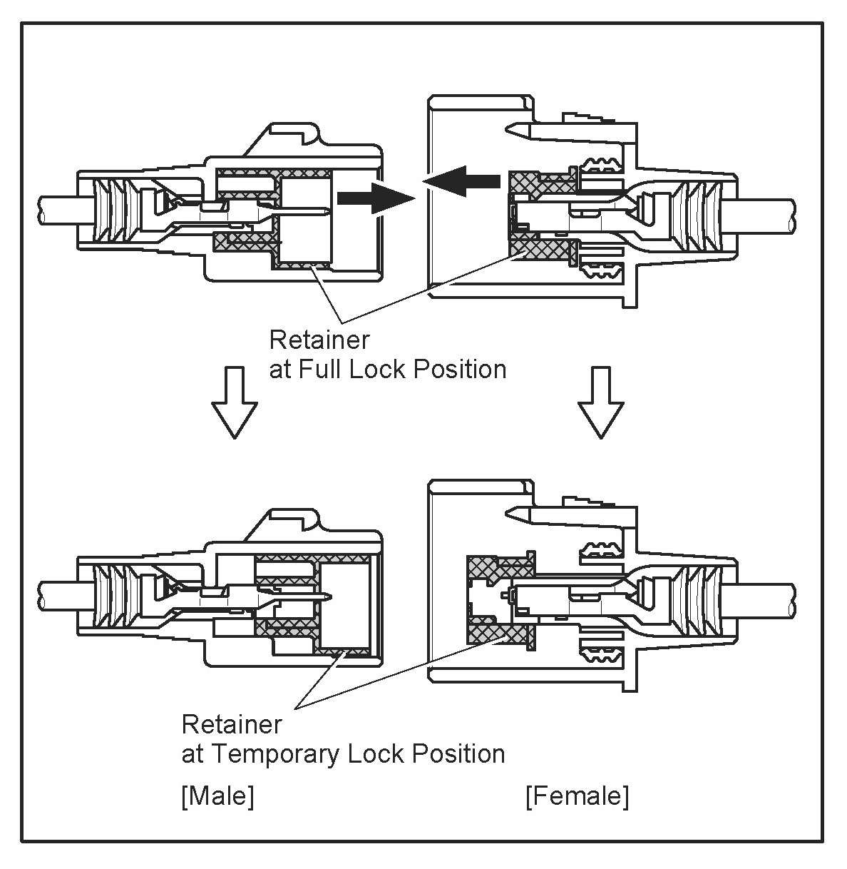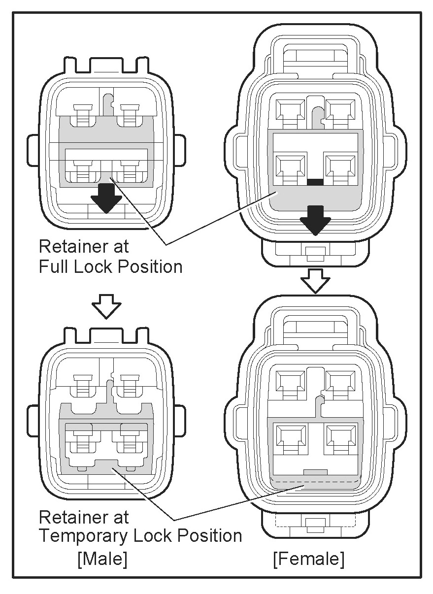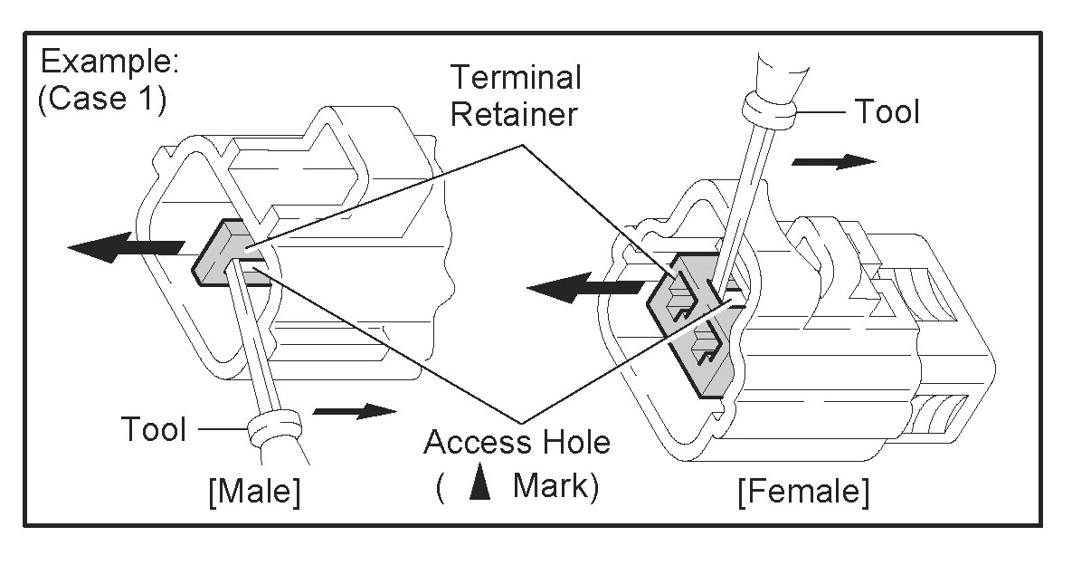 Insert the special tool into the terminal retainer access hole (Triangle Mark) and pull the terminal retainer up to the temporary lock position.