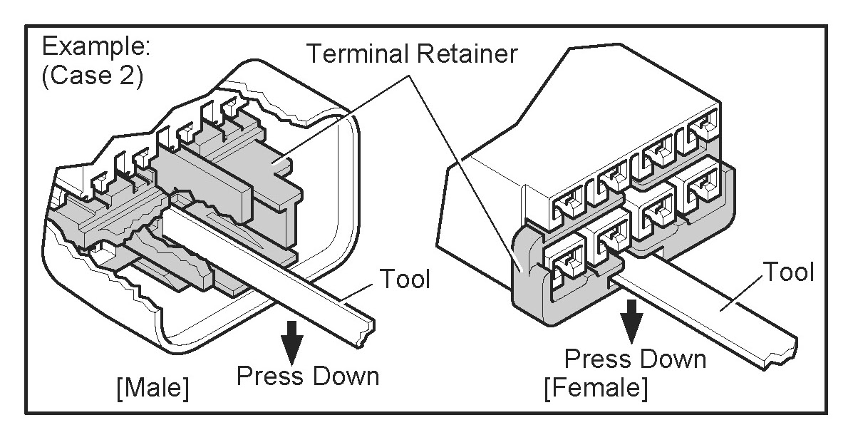 HINT: To remove the terminal from the connector, please construct and use the special tool or like object shown on the left.