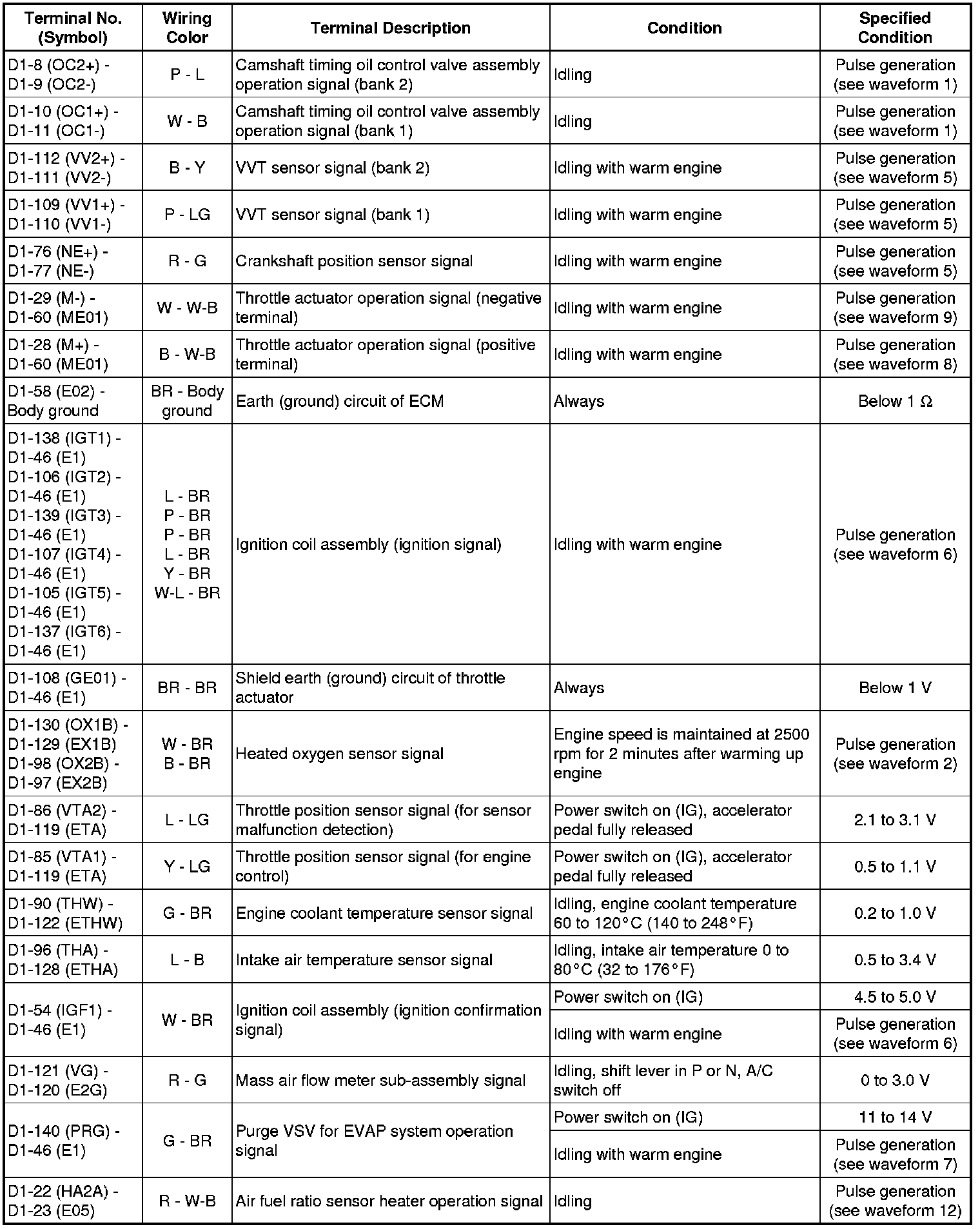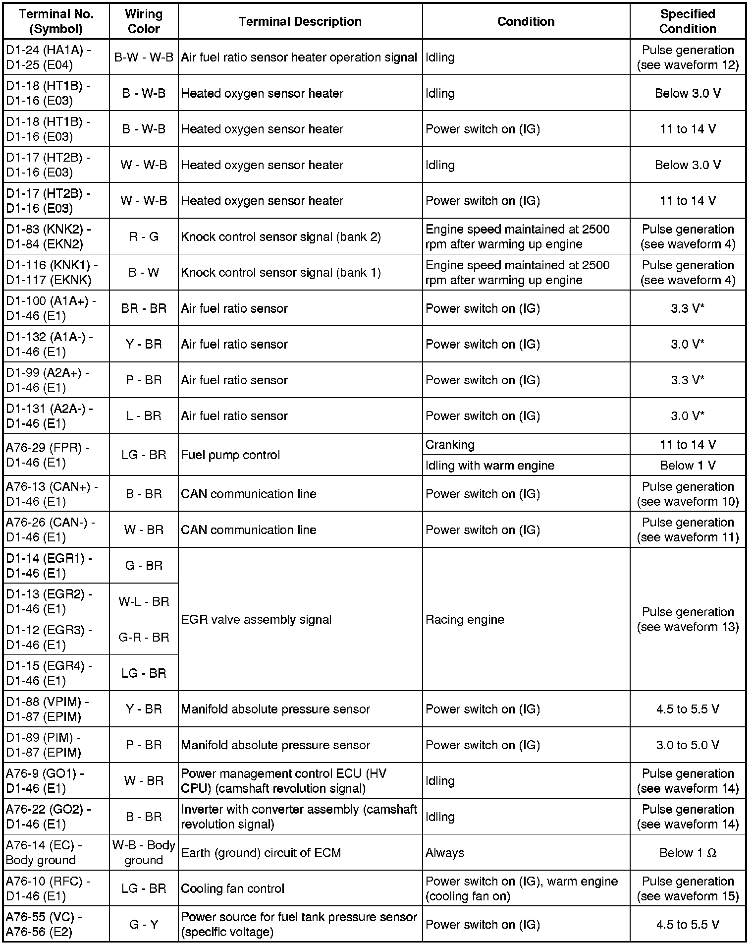 The standard normal voltage between each pair of the ECM terminals is shown in the table below. The appropriate conditions for checking each pair of the terminals are also indicated.