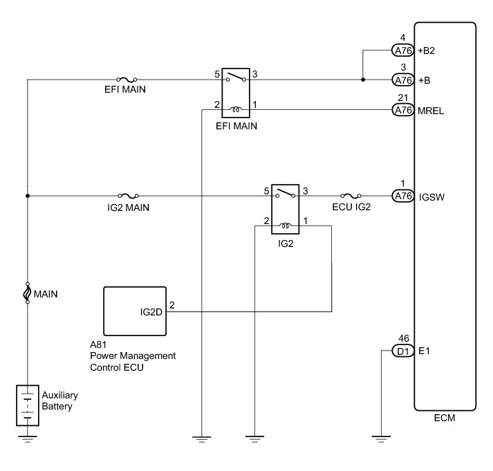 When the power switch is turned on (IG), the auxiliary battery voltage is applied to IGSW of the ECM. The output signal from the MREL terminal of the ECM causes a current to flow to the coil, closing the contact of the EFI MAIN relay and supplying power to terminals +B and +B2 of the ECM.