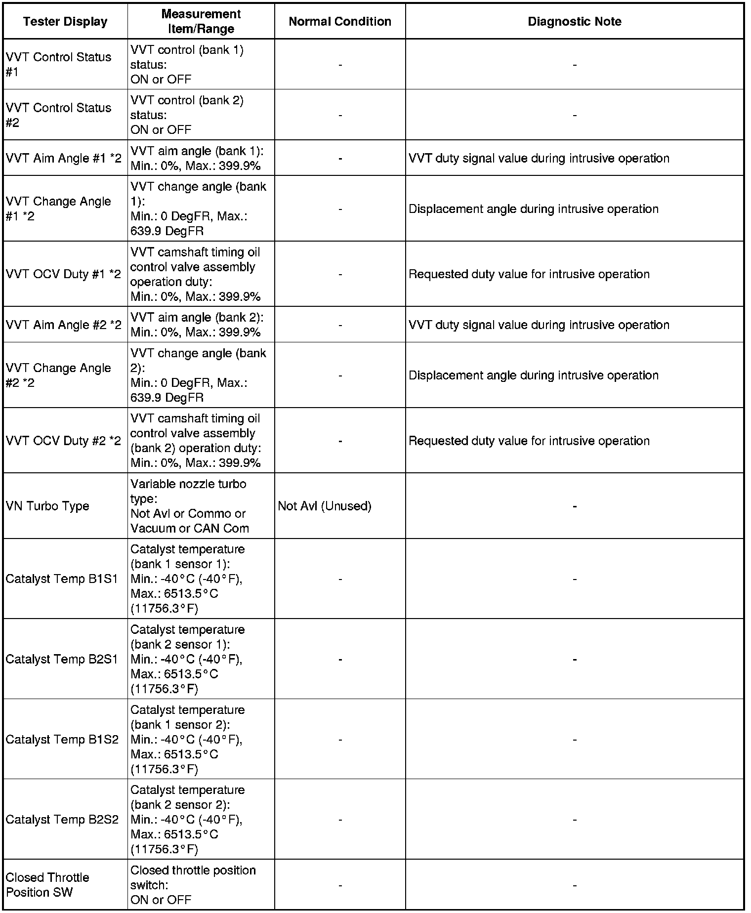 * *2: Data List values are only displayed when performing the following Active Test: Control the VVT System (Bank 1, 2) and Control the VVT Linear (Bank 1, 2). For other Active Test, the Data List value will be 0.