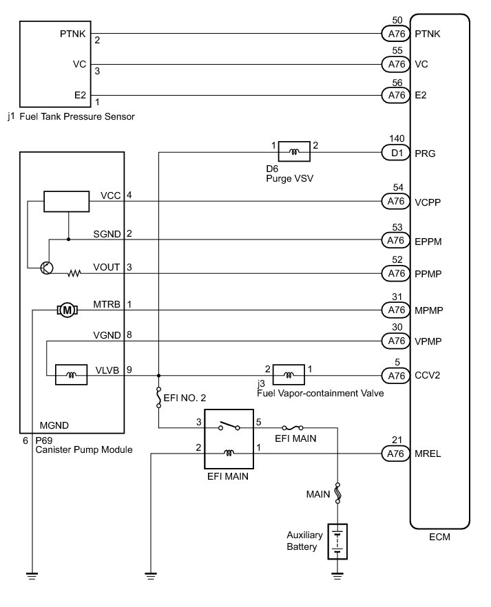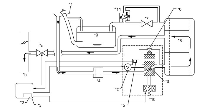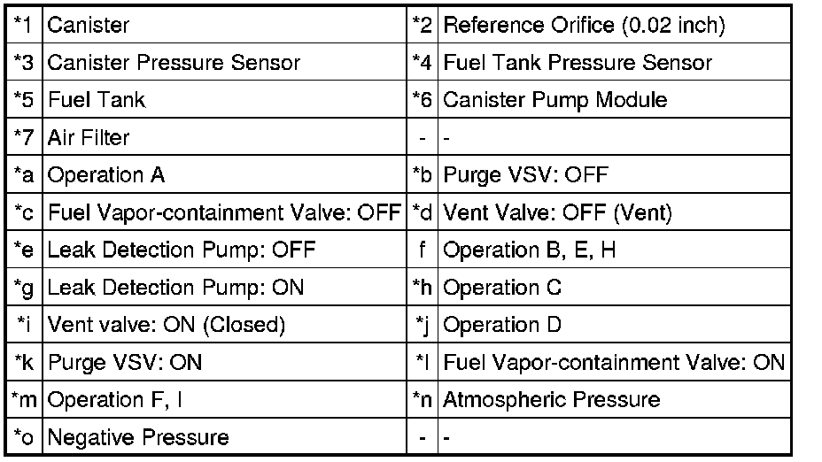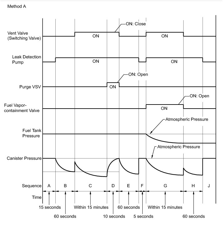 * If the fuel tank pressure is higher or lower than the atmospheric pressure, the system determines that there are no leaks in the closed tank system and the system will check for leaks from the piping and canister between the purge VSV and canister pump module. (Method A)