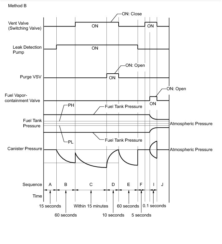 * If the fuel tank pressure is almost the same as the atmospheric pressure, vacuum will be allowed to enter the fuel tank and the system will check for leaks from the fuel tank after checking for leaks from the canister. (Method B)