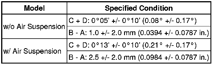 Camber is not adjustable. If the measurement is not within the specified range, inspect the suspension parts for damage and/or wear, and replace them if necessary.