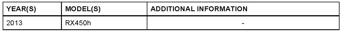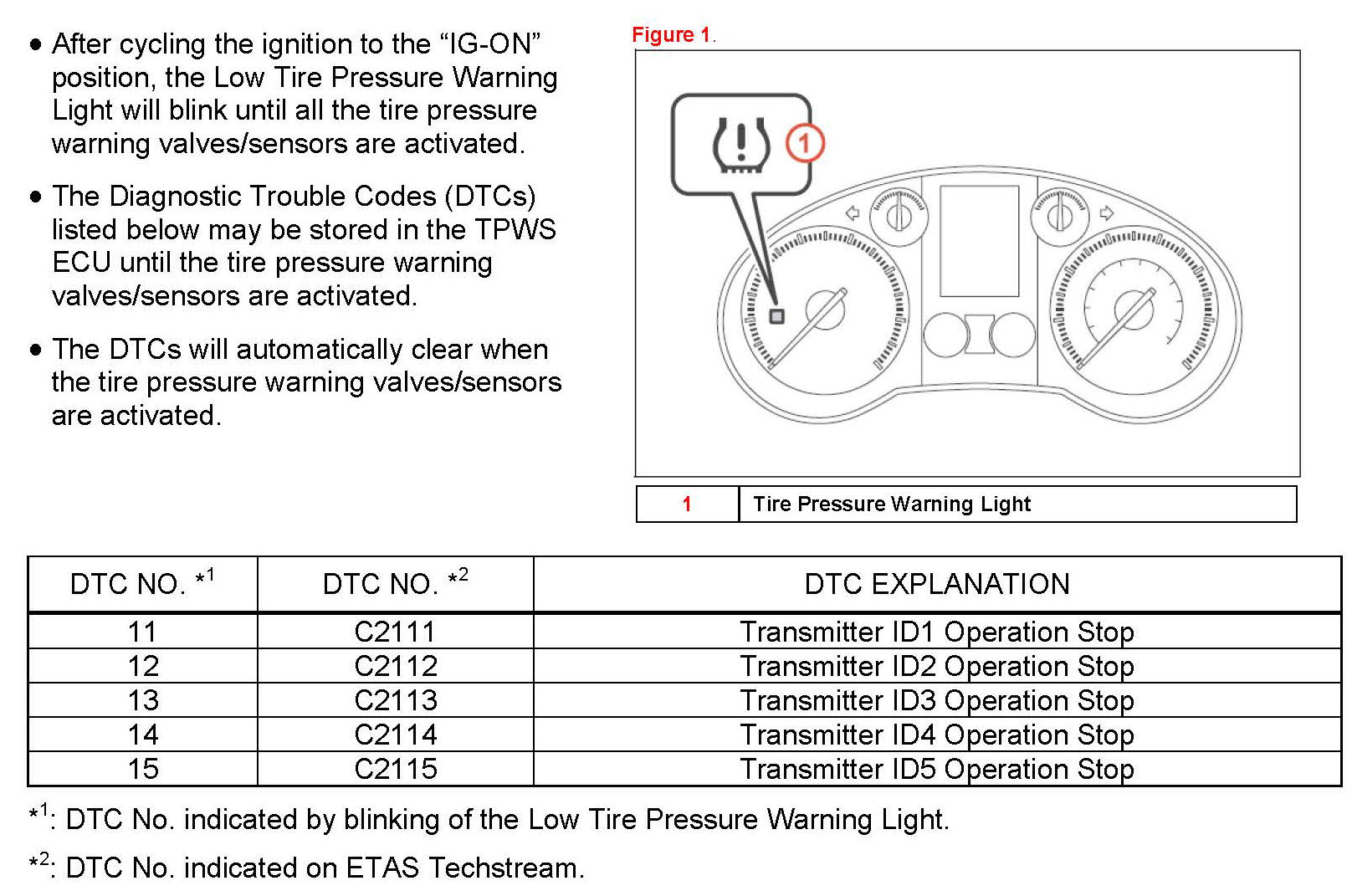 2013 model year RX45Oh vehicles are equipped with a direct4ype Tire Pressure Warning System (TPWS). Each tire (including the spare tire) has a tire pressure warning valve/sensor and the measured tire pressure data is transmitted to the Tire Pressure Warning System antenna/receiver to the Tire Pressure Warning System ECU