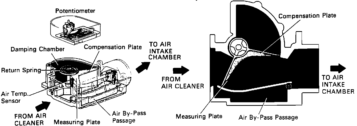 An external potentiometer is connected directly to the measuring plate pivot. As the plate deflects due to incoming air, the resistance value of the potentiometer changes. The ECU reads the resistance change by monitoring voltage drop through the sensor.