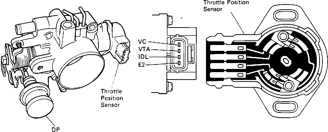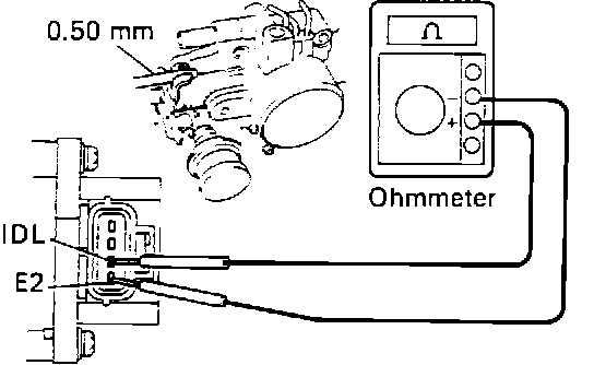 - Connect ohmmeter across throttle sensor terminals E2 and IDL.