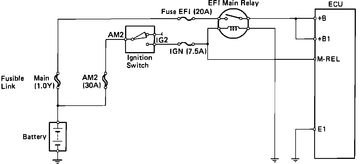 When the ignition switch is turned to the ON position, the relay coil is energized. When powered the relay contacts close, sending battery voltage to ECU terminals +B and +B1.
