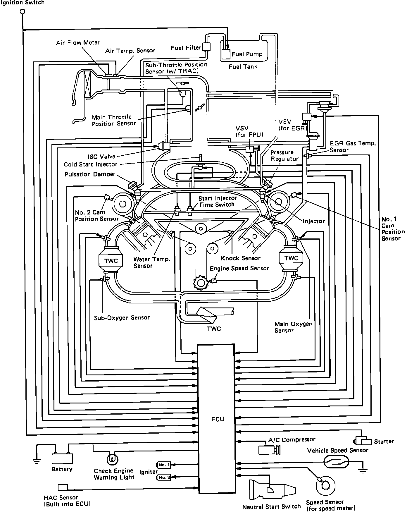 The vehicle ECU and sensor and output systems control virtually all aspects of engine operation. This combined systems control allows the engine to function at optimum performance while maintaining exceptable emission and fuel economy levels.