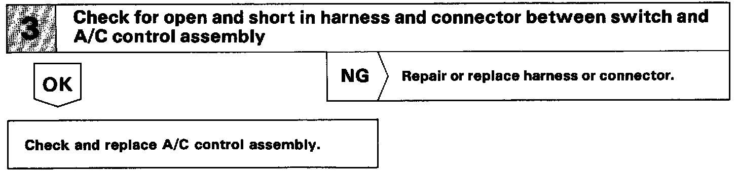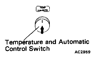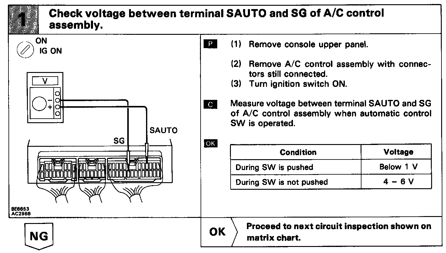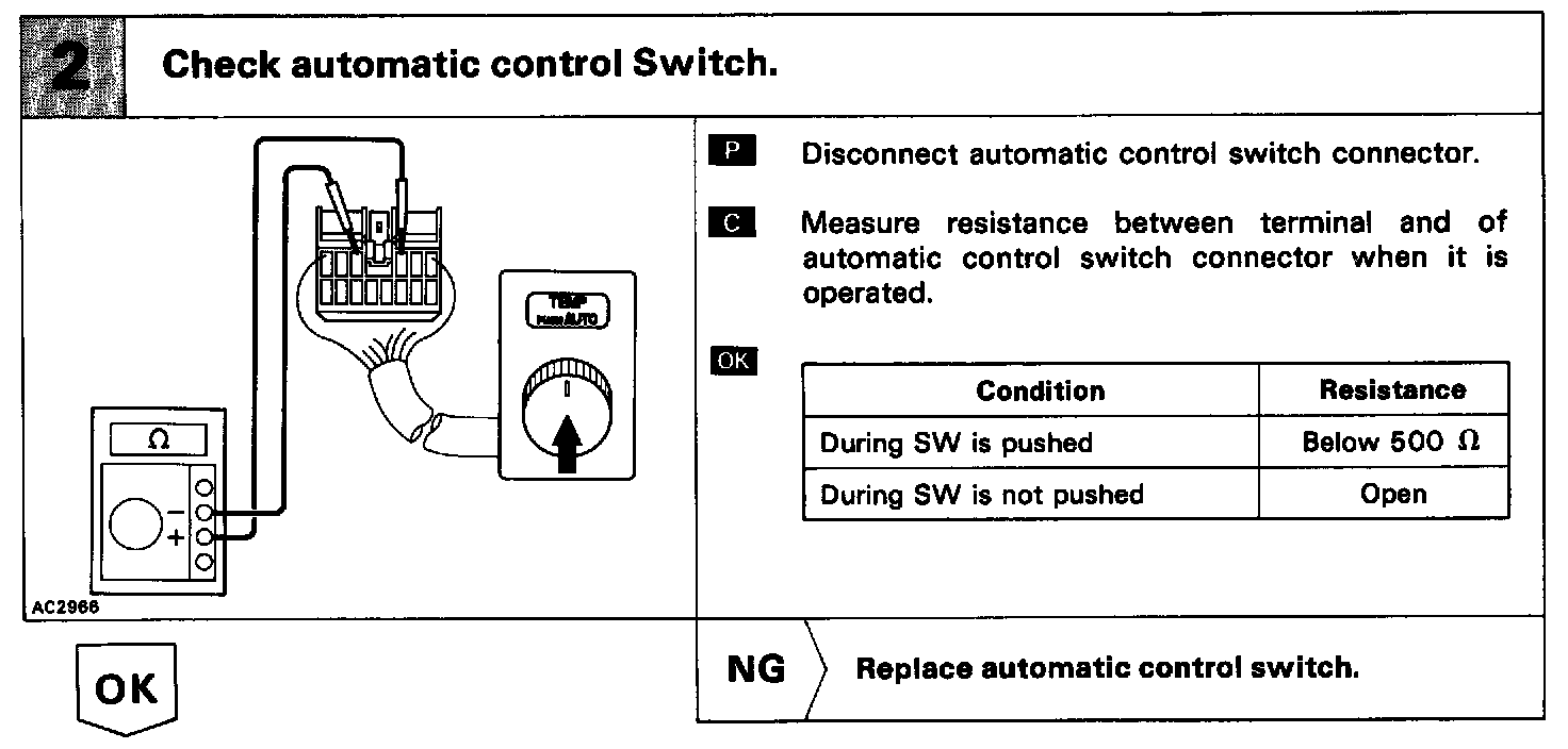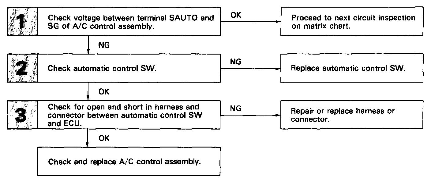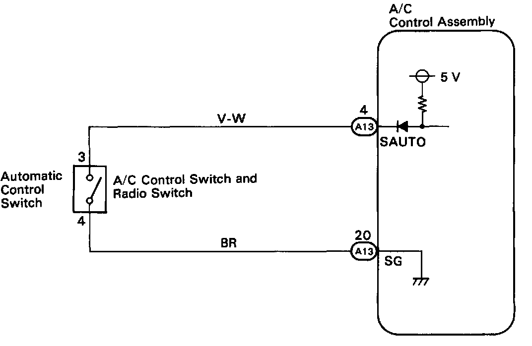 The SW contact is ON while the automatic control SW is pushed, and turns OFF when automatic control SW is released. When the SW is turned ON, the voltage at the AUTO terminal of A/C control assembly is almost 0 V and the ECU begins fully automatic control of the blower speed, air inlet, air outlet and compressor operation.