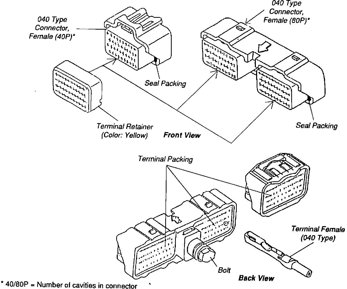 Under no circumstances should these connectors be back probed. If the connector requires a test usually performed by back probing, it is critical that the break-out box (P/N 00231-01000) be utilized.