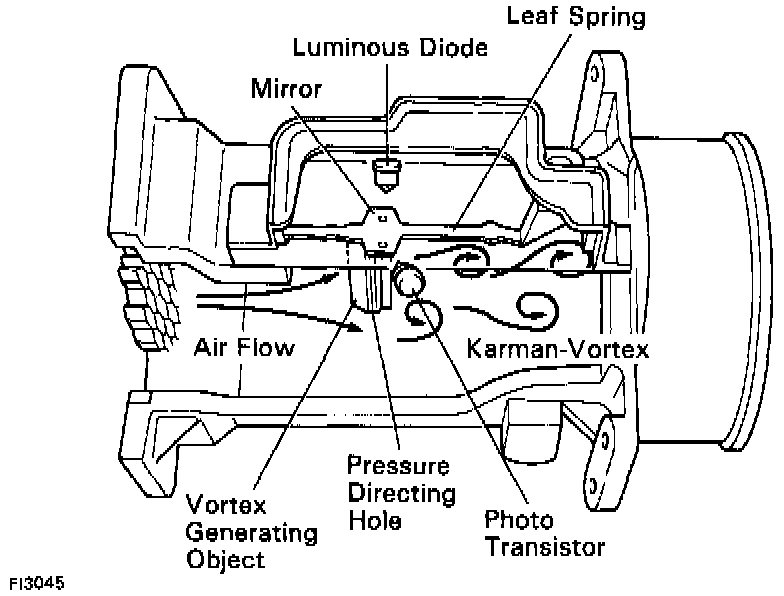 As shown in the figure, when a pillar (Vortex generating body) is placed in the path of a uniform flow, vortices called Karman-Vortex are generated downstream of the object. Using this principle, a vortex generator is placed inside the Volume Air Flow Meter. By measuring the frequency of the vortices generated, the Engine Control Module can determine the volume of air flowing through the Volume Air Flow Meter. The vortices are detected by their exerting pressure on thin metal foil (mirror) surfaces and a light emitting element and light receptor (LED and photo transistor) positioned opposite the mirror which optically senses the vibrations in the mirror. The Engine Control Module uses these signals mainly for calculation of the basic injection volume and the basic ignition advance angle.