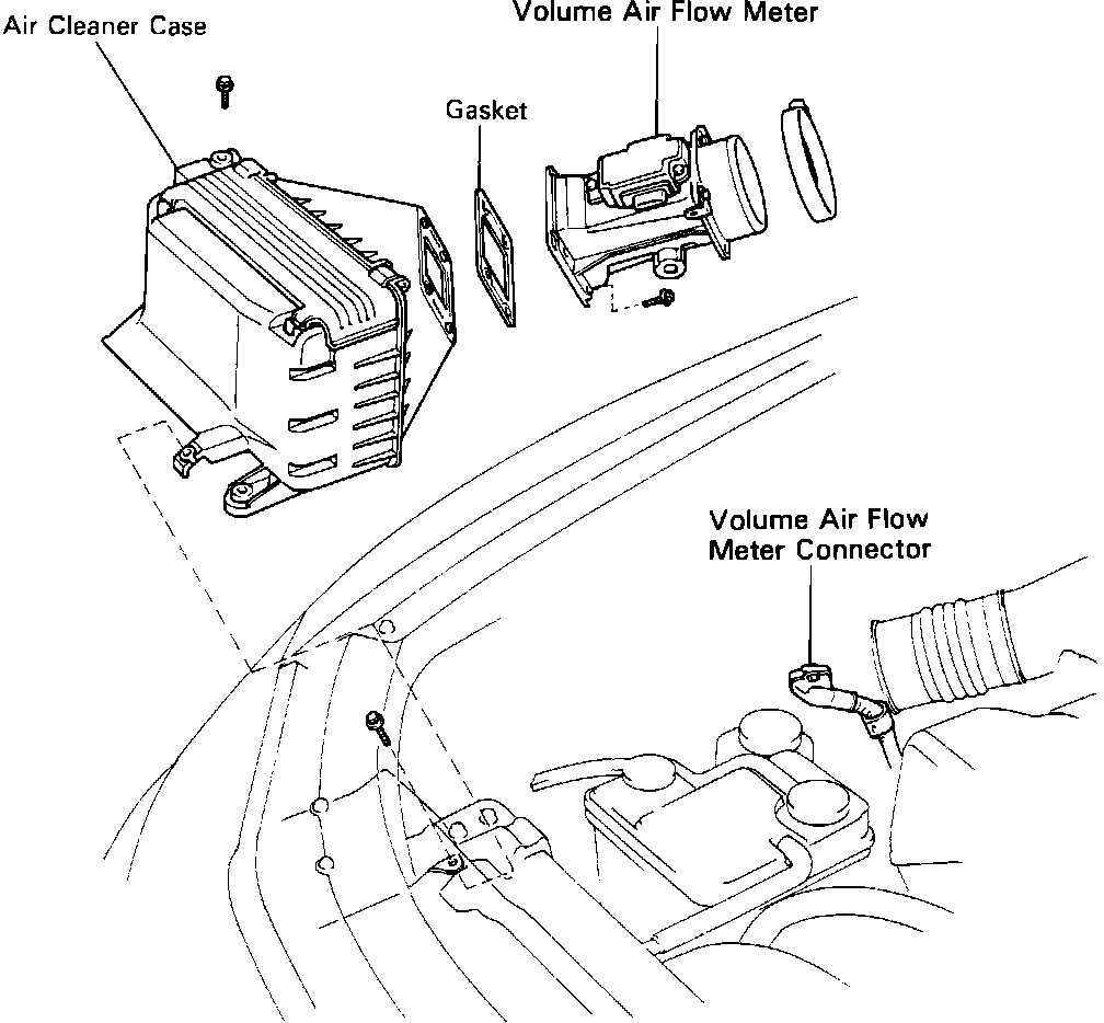 (d) Disconnect the air duct from the air cleaner case, and remove the air cleaner case and volume air flow meter.