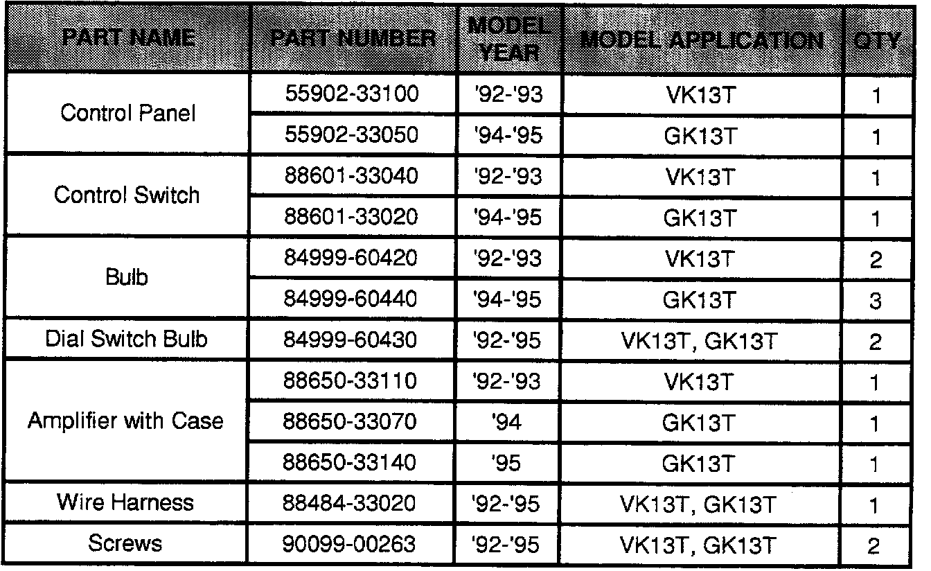 To allow repairs to the A/C Control Assembly, service parts are now available. The following information on parts and troubleshooting will aid you in addressing complaints with the LCD display, night illumination or switch indicators.