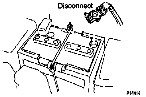 CAUTION: Work must be started after 90 seconds from the time the Ignition switch Is turned to the LOCK position and the negative (-) terminal cable is disconnected from the battery.