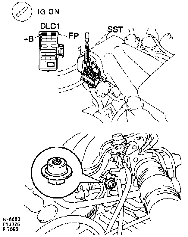- Turn Ignition Switch ON. Using jumper connect terminals FP and + B of Data Link Connector 1 (SST 09843-18020).
