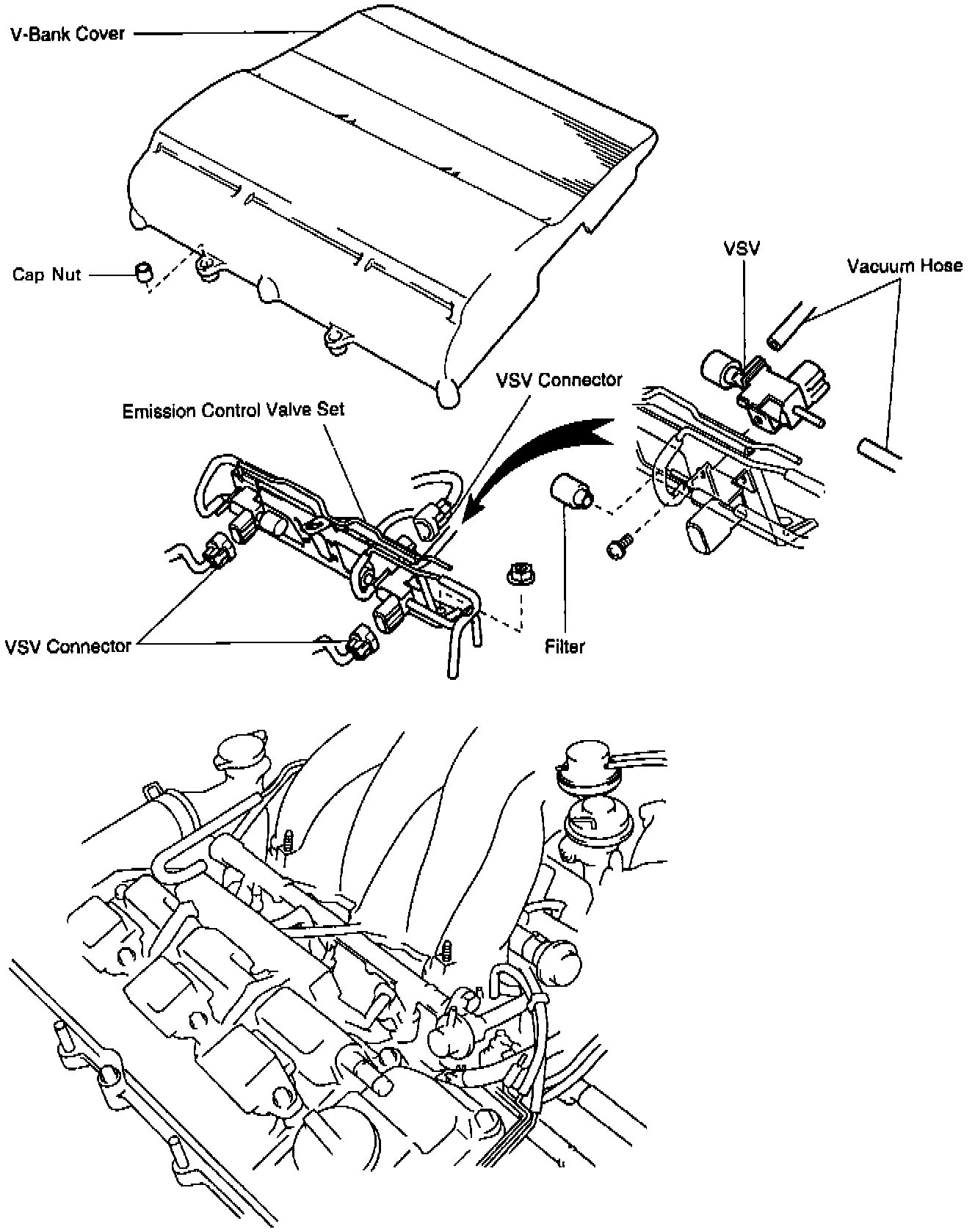 - Disconnect the 2 vacuum hoses and connector from the VSV.