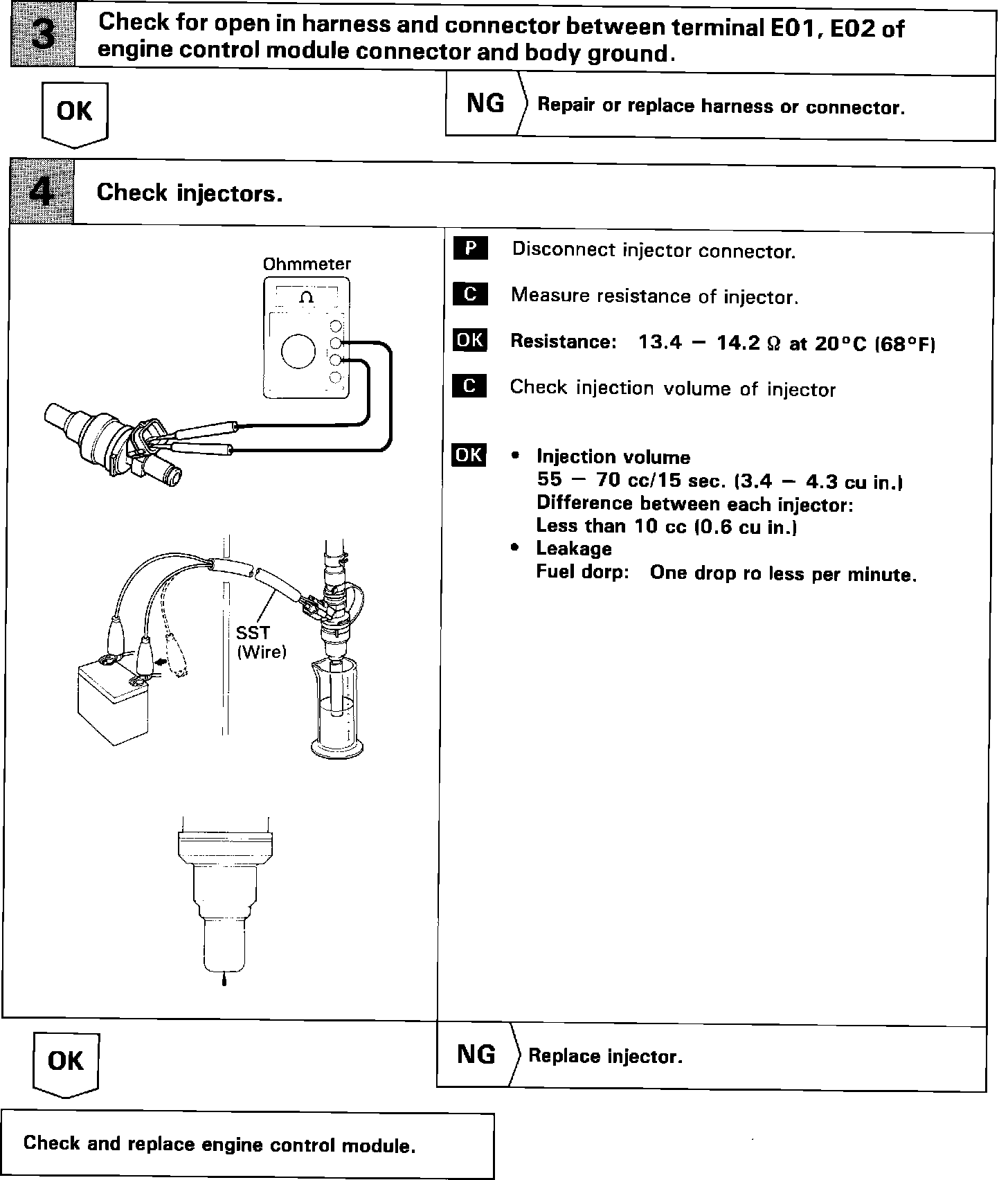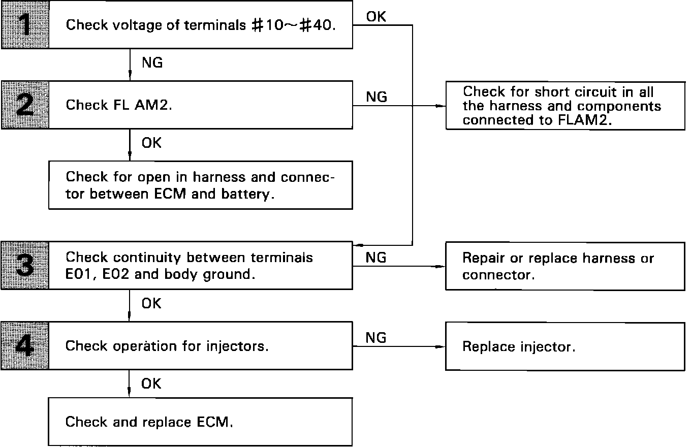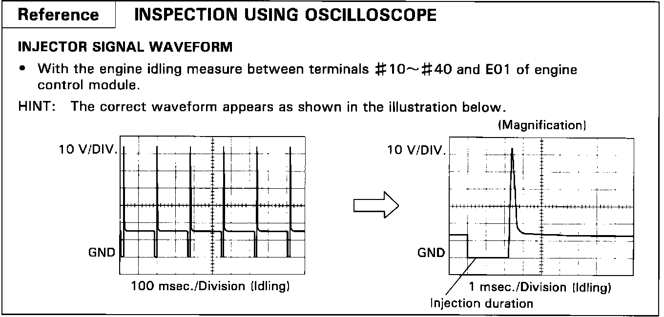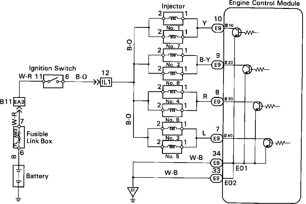 Circuit DescriptionThe injectors are installed on the intake manifold. They inject fuel into the cylinders based on the signals from the engine control module.