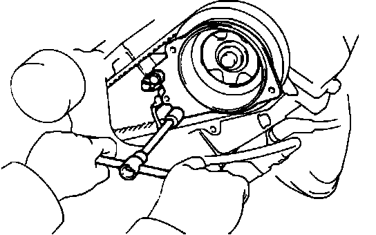 - Verify camshaft pulleys align with mark on top of housing.