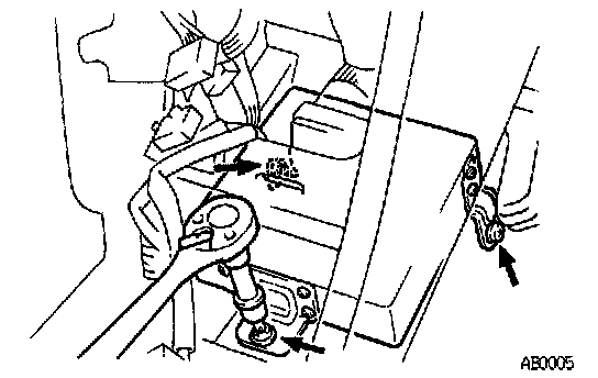 CENTER AIRBAG SENSOR ASSEMBLY REMOVAL AND INSTALLATIONCAUTION: Work must be started after 90 seconds from the time the ignition switch is turned to the LOCK position and the negative (-) terminal cable is disconnected from the battery.