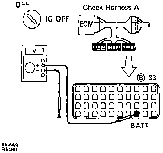 - Measure voltage between terminal BATT of Engine Control Module connector and body ground.