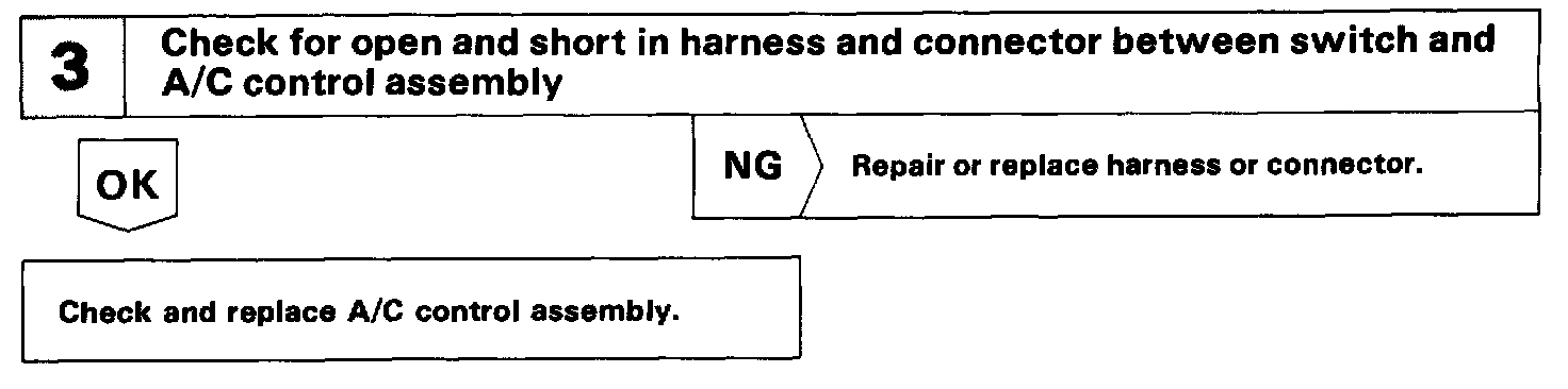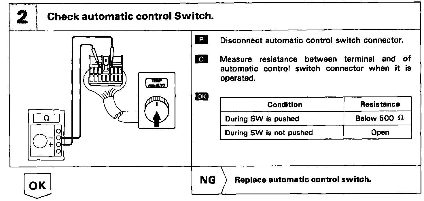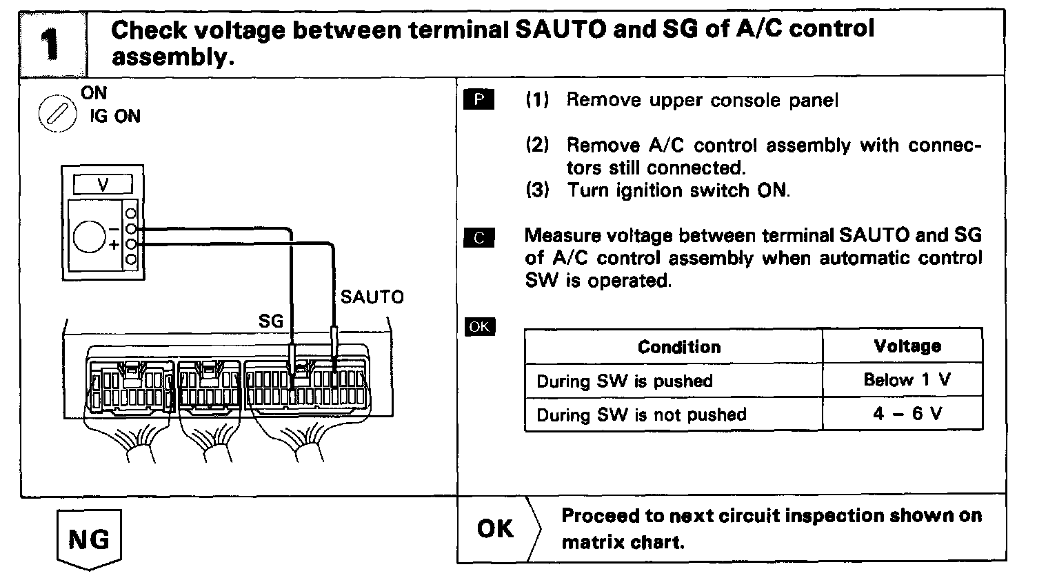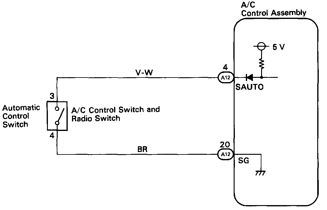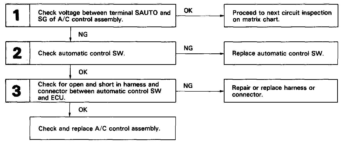The SW contact is ON while the automatic control SW is pushed, and turns OFF when automatic control SW is released. When the SW is turned ON, the voltage at the SAUTO terminal of A/C control assembly is almost O V and the ECU begins fully automatic control of the blower speed, air inlet, air outlet and compressor operation.