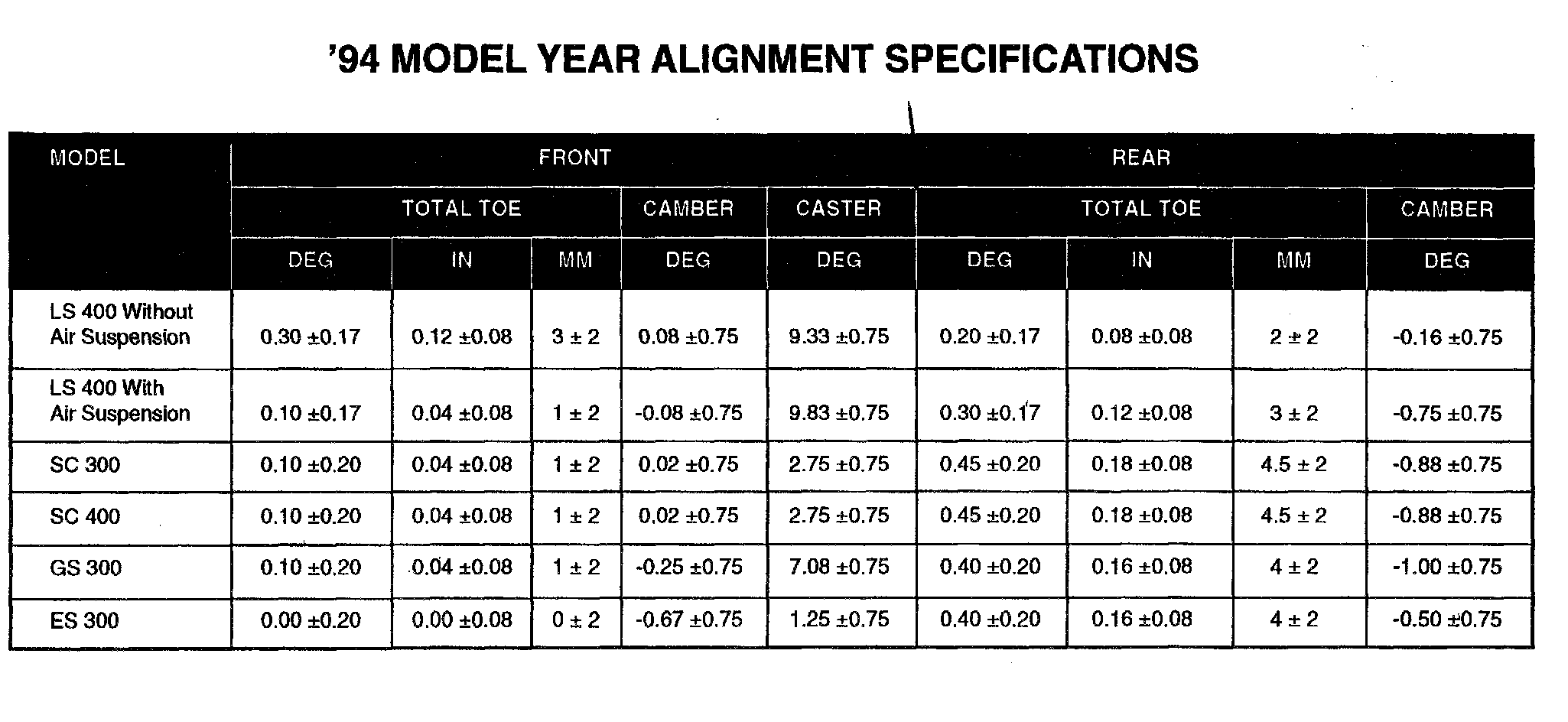 Title: 94 MODEL YEAR VEHICLE ALIGNMENT SPECIFICATIONS