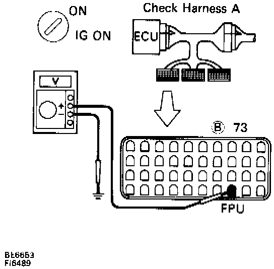 2. Check voltage between terminal FPU of Engine Control Module connector and body ground.
