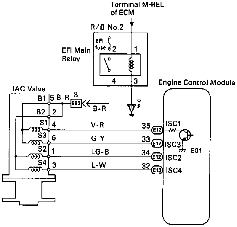 2. Check for open and short in harness and connector between EFI Main Relay and Idle Air Control Valve, Idle Air Control Valve and Engine Control Module.