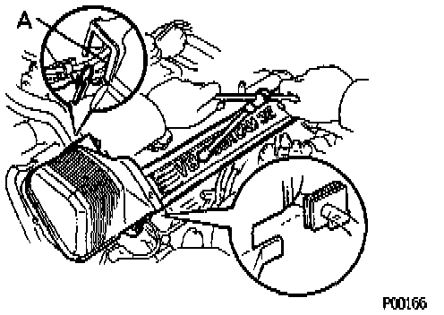 - Fit the portion A of the timing belt cover, matching it with the lower high - tension cord cover.