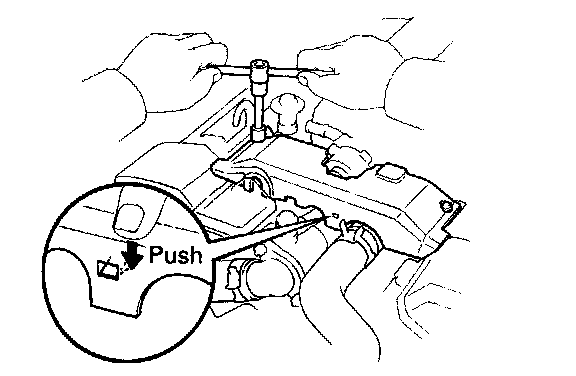 (b) Push the front side of the high-tension cord cover, and connect the front side claw groove of the upper high-tension cord cover to the claw of the lower high-tension cord cover.