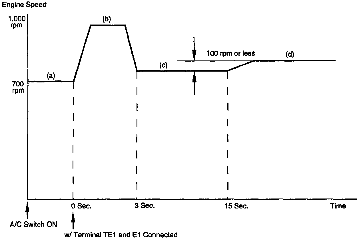 - Using SST (SST 09843-18020) connect terminals TE1 and E1 of the DLC1. check that idle-up occurs for approx. 3 seconds.