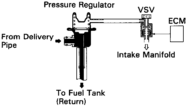 The ECM turns on the VSV (Vacuum Switching Valve) to draw the air into the diaphragm chamber of the pressure regulator if it detects that the temperature of the engine coolant is too high during engine starting.