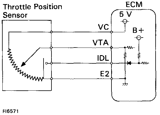 At this time, a voltage of approximately 0.7 V is applied to terminal VTA of the ECM. When the throttle valve is opened, the IDL contacts go off and thus the power source voltage of approximately 12 V in the ECM is applied to the terminal IDL of the ECM.