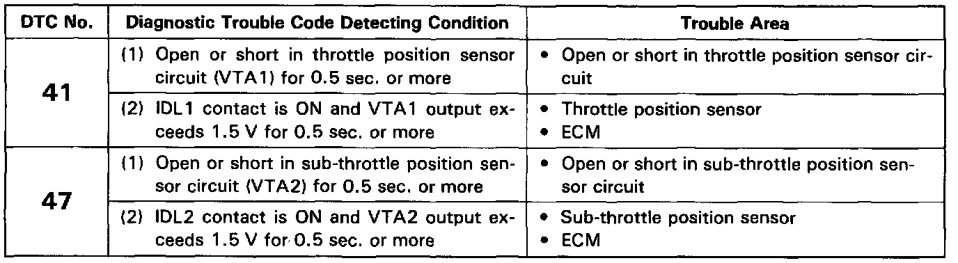 - When the connector for the throttle position sensor(s) is disconnected, diagnostic trouble code 41 or 47 is not displayed. Diagnostic trouble code 41 or 47 is displayed only when there is an open or short in the VTA signal circuit of the throttle position sensor(s).