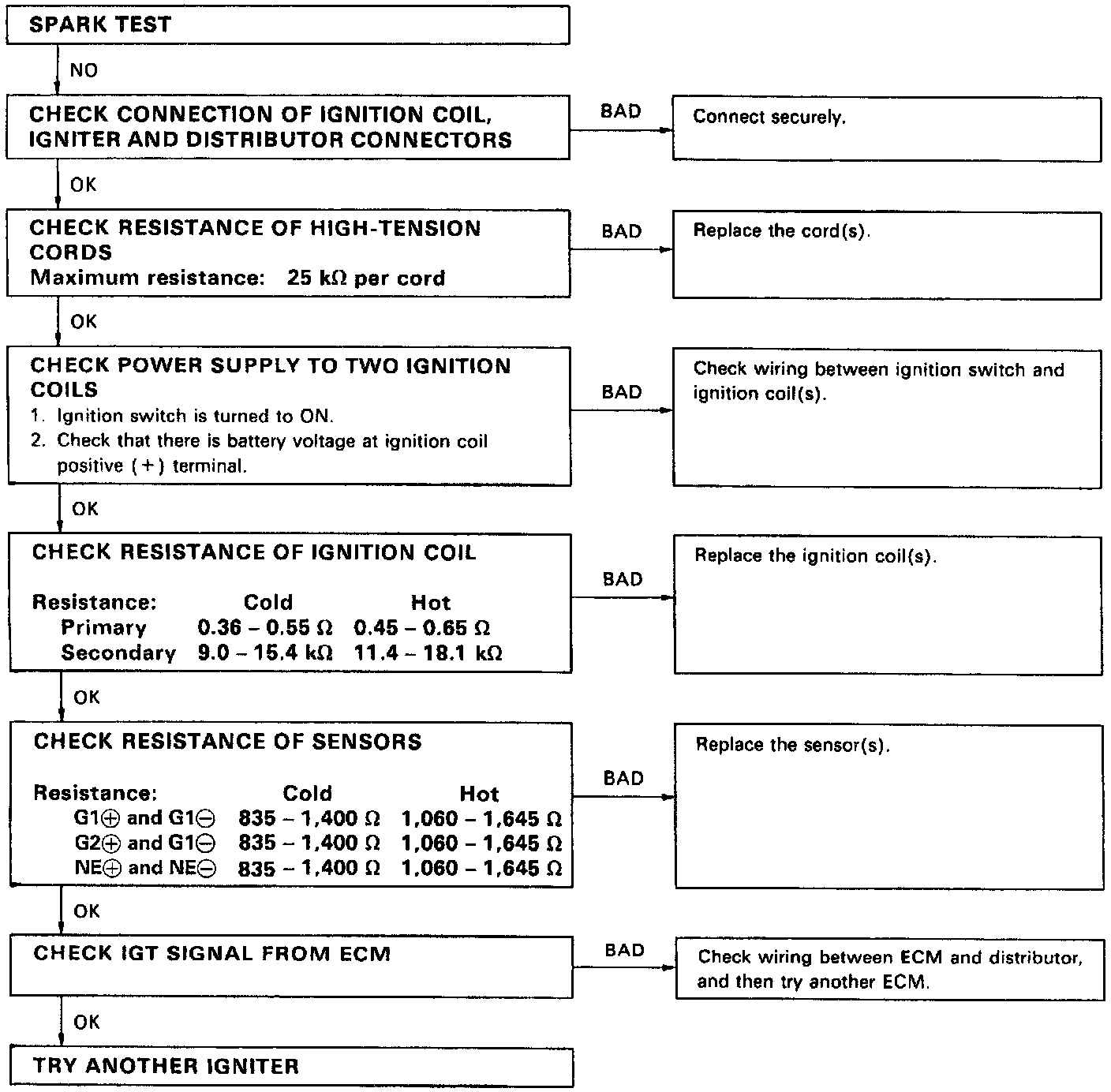 ^ If spark occurs, reconnect the high-tension cords to the distributor caps.