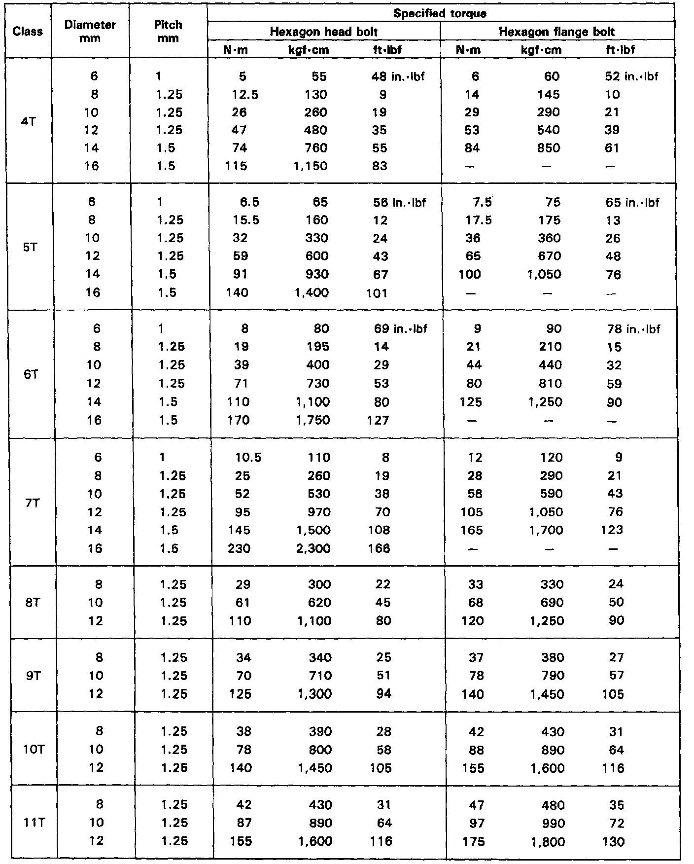 SPECIFIED TORQUE FOR STANDARD BOLTS