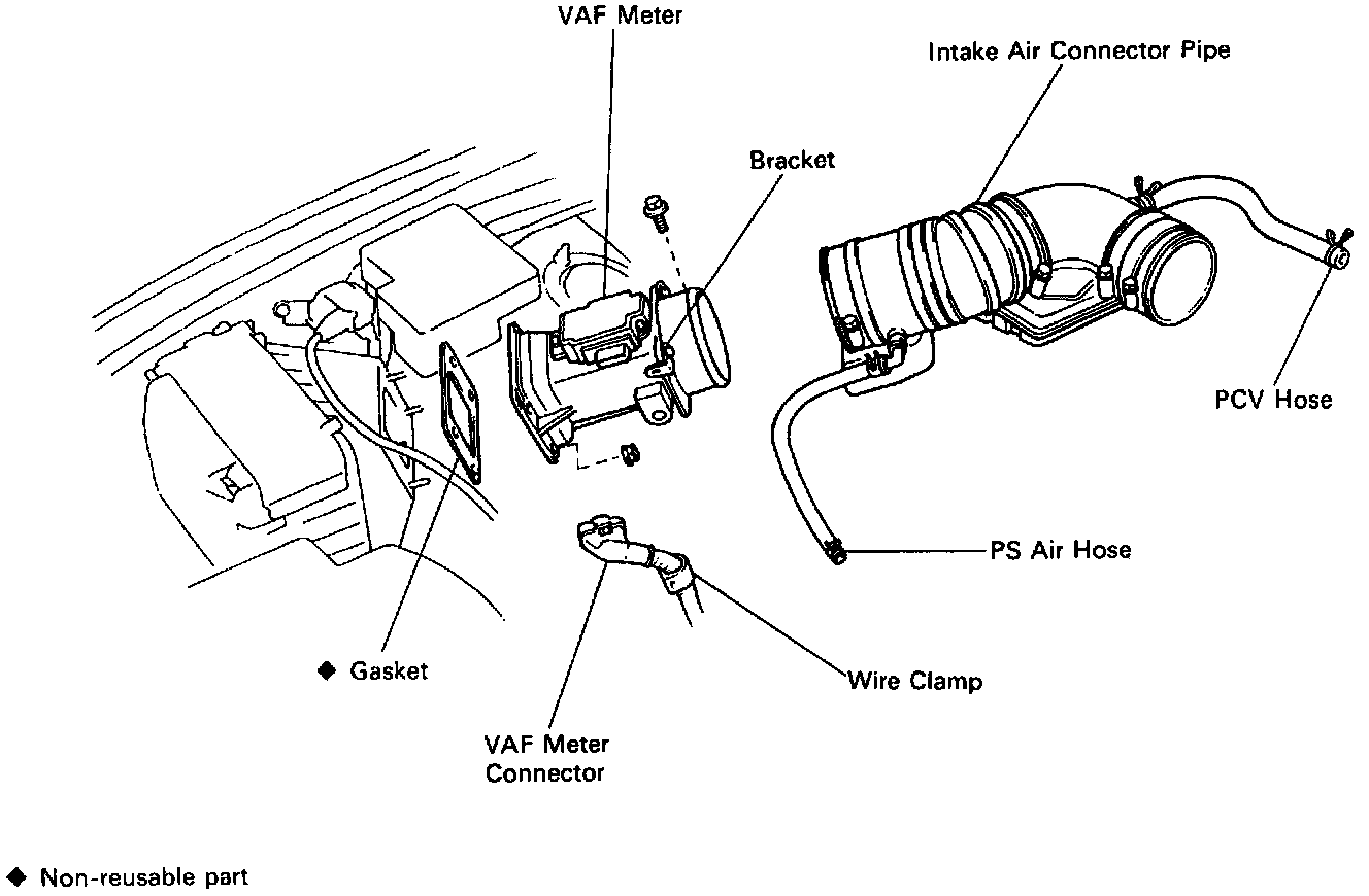- Remove the 4 nuts, bolt, VAF meter and gasket.
