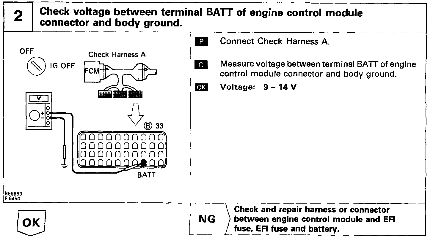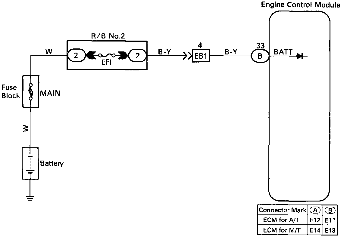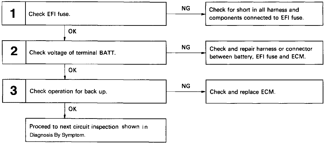 CIRCUIT DESCRIPTIONBattery positive voltage is supplied to terminal BATT of the ECM even if when the ignition switch is off, for use by the diagnostic trouble code memory and air-fuel ratio adaptive control value memory, etc.