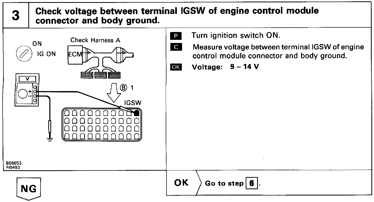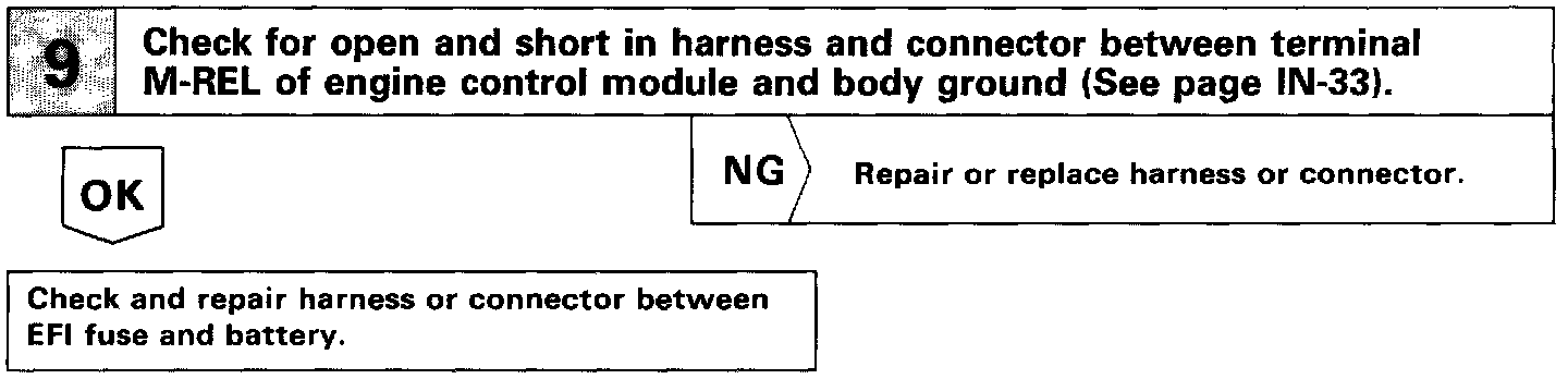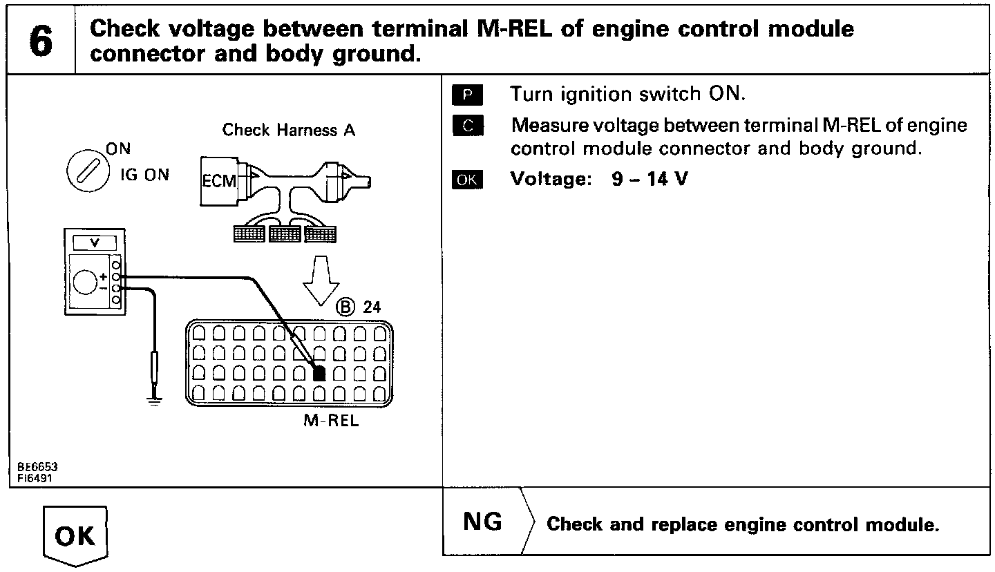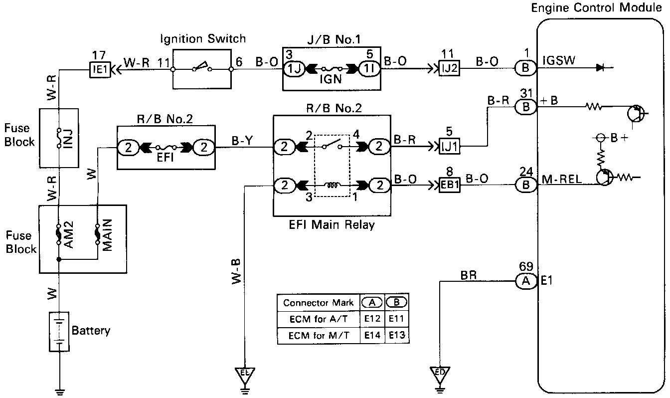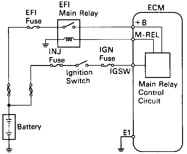 When the ignition switch is turned on, battery positive voltage is applied to the terminal IGSW of the ECM, and the main relay control circuit in the ECM sends a signal to the terminal M-REL of the ECM, switching on the main relay. This signal causes current to flow to the coil, closing the contacts of the main relay and supplying power to the terminal + B of the ECM.