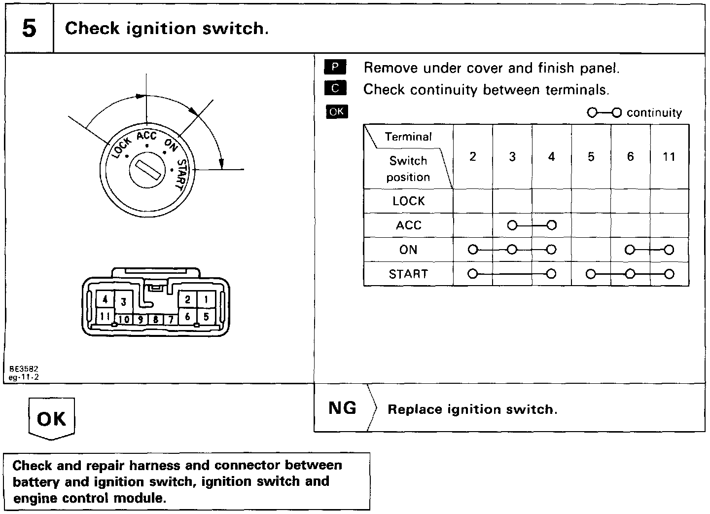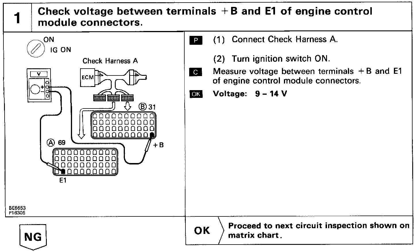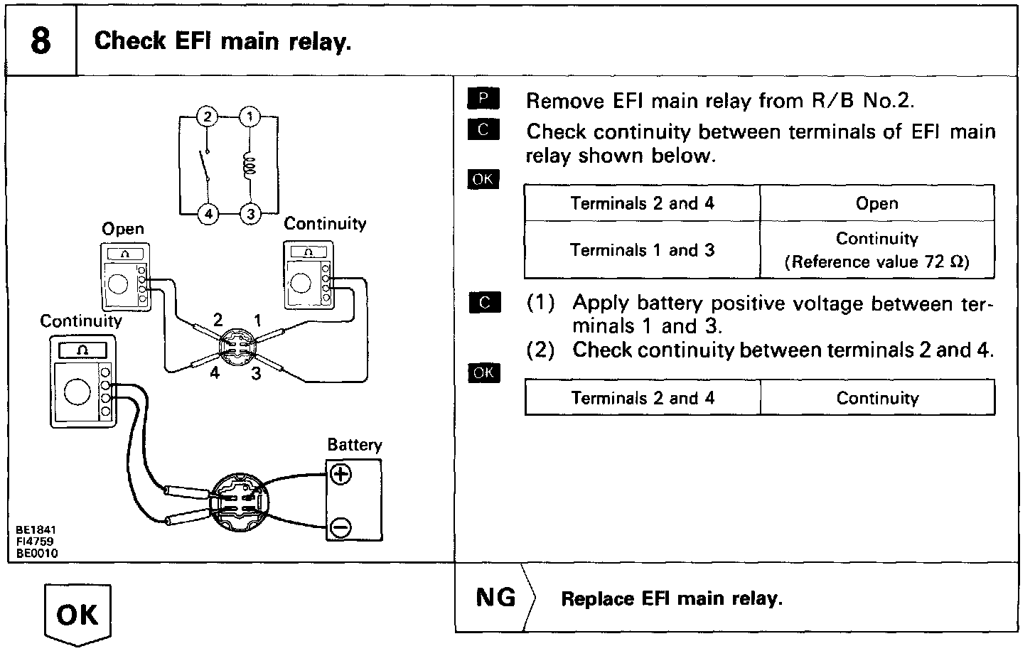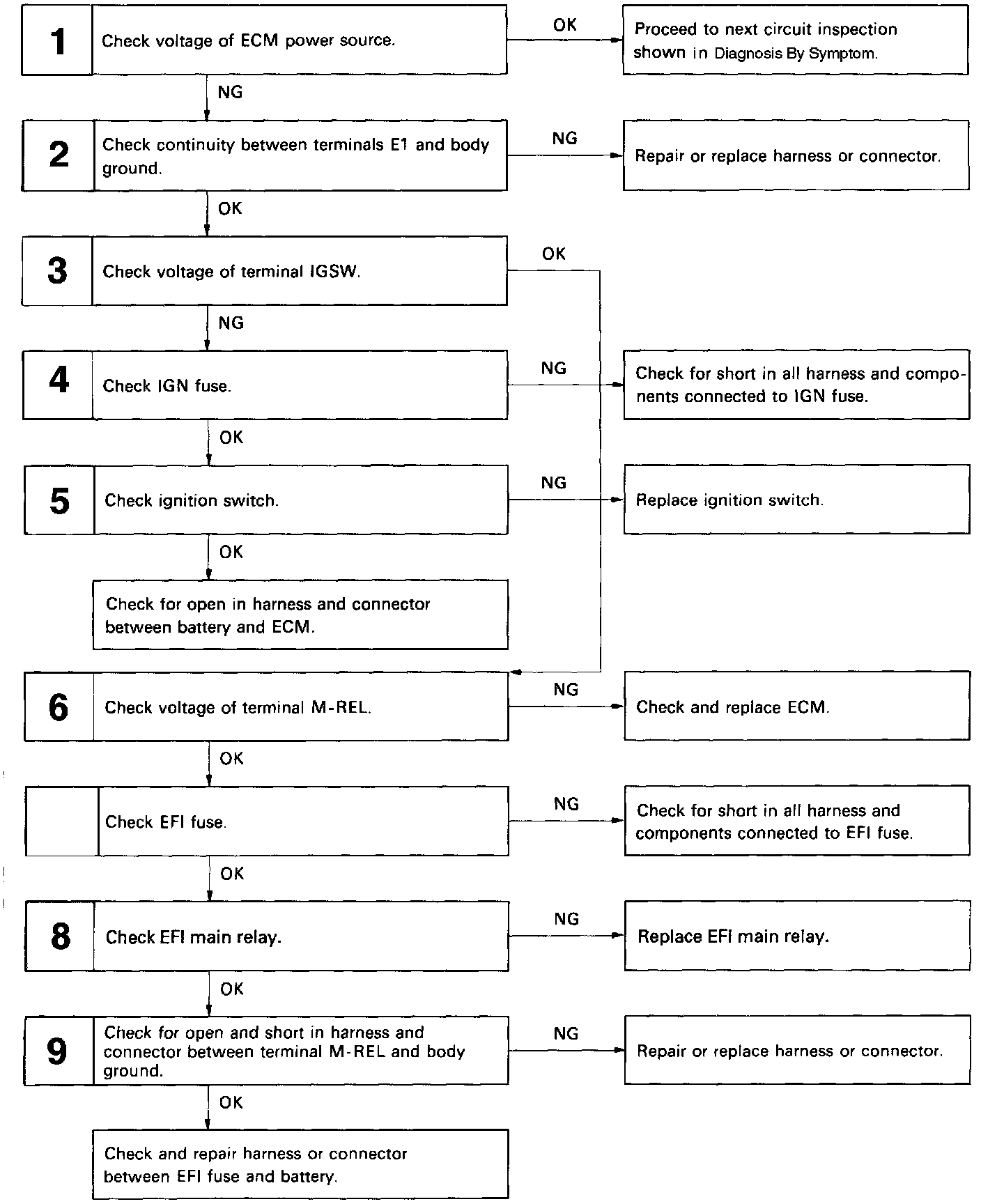 When the ignition switch is turned on, battery positive voltage is applied to the terminal IGSW of the ECM, and the main relay control circuit in the ECM sends a signal to the terminal M-REL of the ECM, switching on the main relay. This signal causes current to flow to the coil, closing the contacts of the main relay and supplying power to the terminal + B of the ECM.