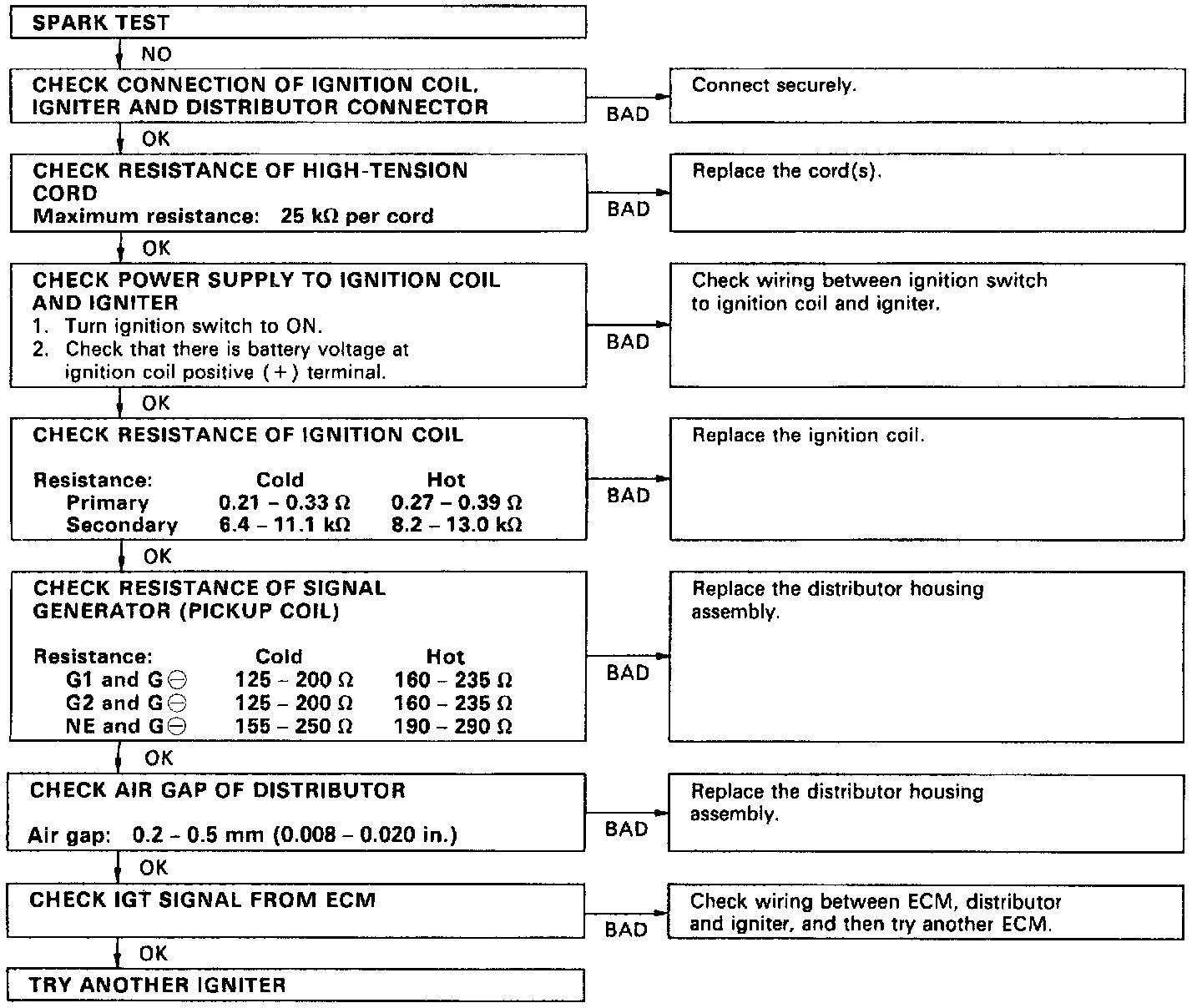 CHECK THAT SPARK OCCURS:- Disconnect the high-tension cord (from the ignition coil) from the distributor cap.