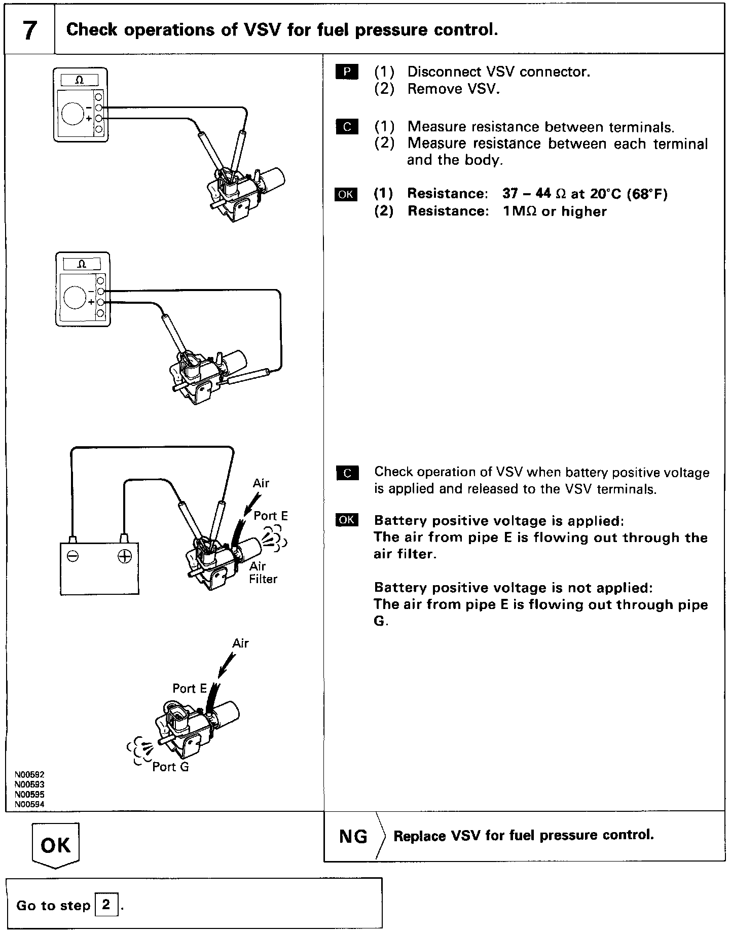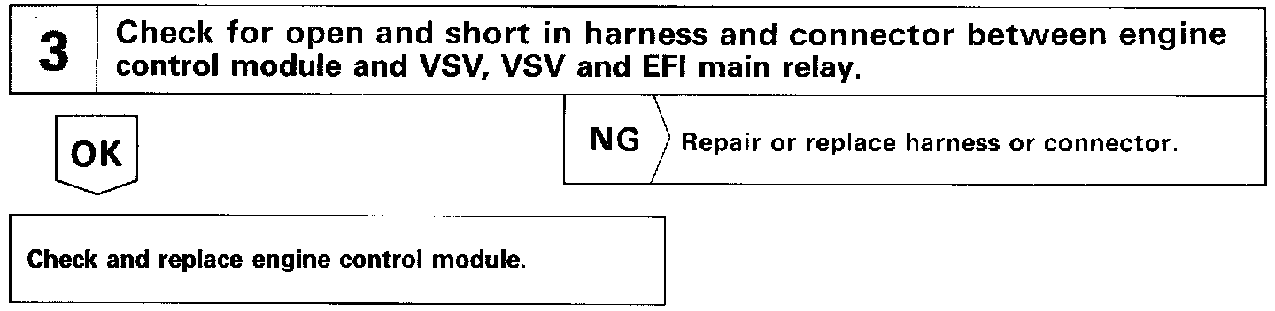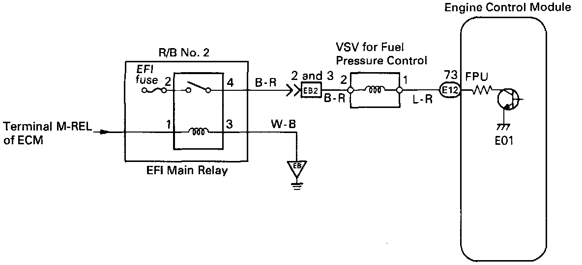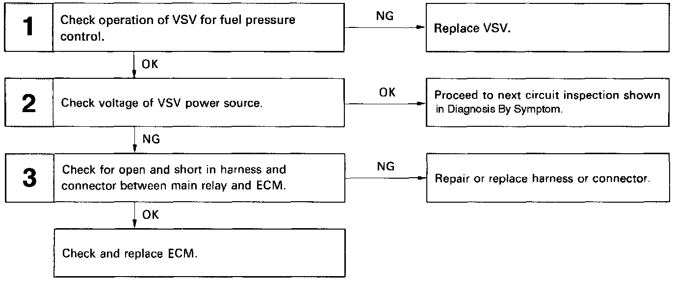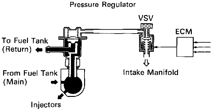 The ECM turns on a Vacuum Switching Valve (VSV) to draw the air into the diaphragm chamber of the pressure regulator if it detects that the temperature of the engine coolant is too high during engine starting. The air drawn into the chamber increases the fuel pressure to prevent fuel vapor lock at high engine temperature in order to help the engine start when it is warm. Fuel pressure control ends approx. 100 seconds. after the engine is started.