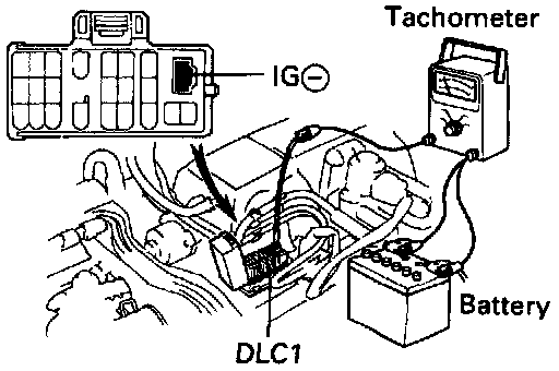 - Connect the tester probe of a tachometer to terminal IG(-) of the DLC1.