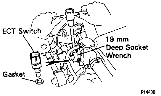 - Using a 19 mm deep socket wrench, remove the ECT sensor and gasket.