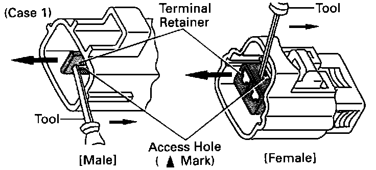 Insert the tool straight into the access hole of terminal retainer as shown