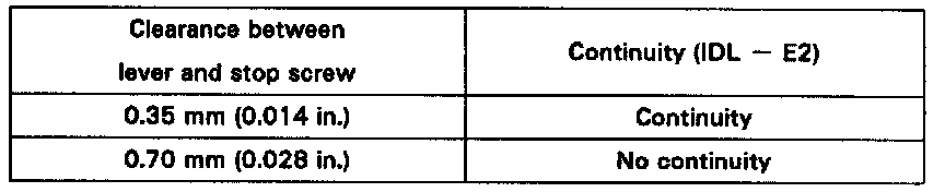 - Insert a 0.54 mm (0.021 in.) feeler gauge, between the throttle stop screw and stop lever.