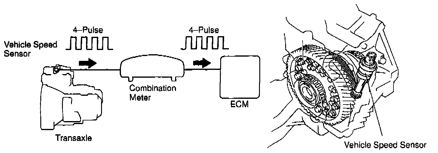 Vehicle Speed SensorThe vehicle speed sensor outputs a 4-pulse signal for every revolution of the rotor shaft, which is rotated by the transmission output shaft via the driven gear.